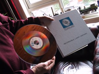Een ander bijzonder item is een laserdisc-speler. "Wist je dat er in die tijd al beschrijfbare laserdisc's bestonden?" Van Dijk laat een tweezijdig beschijfbare laserdisc zien, die slechts deels gebruikt is. "Deze is vermoedelijk al gemaakt in de jaren zeventig. Dat is vooral grappig als je je realiseert dat dit de voorloper is van de CD en van de DVD, ondanks dat ze zo groot zijn als een LP. Een nadeel van deze disc's ten opzichte van een CD is dat ze zo enorm kwetsbaar zijn. De data bevindt zich aan de kant waar deze uitgelezen wordt. Bij de huidige CD's zitten de gegevens juist net onder het etiket, waardoor het allemaal een stuk minder kwetsbaar is. Een ander nadeel van veel van de beeldplaten die vaak te koop worden aangeboden is dat ze in NTSC zijn. Om die af te spelen moeten zowel je afspeelapparaat als het televisietoestel voor die norm geschikt zijn." |
