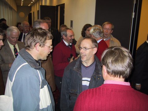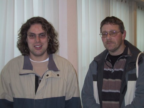 Jos Frijling, PE3JF uit Oldenzaal en Henk Emmelkamp. PE5HWE, uit Drenthe komen net geslaagd en de examenruimte uit. Zij behoren tot de een na laatste lichting. Jos: "Ik had wel wat last van de zenuwen." Henk: "Bij mij ging de eerste opneemproef moeizamer dan de tweede. Ik had drie fouten, terwijl vier maximaal toegestaan is. Wij wilden het alletwee per se halen. Ik werk als een soort regelneef in Roemenië. Ik renoveer daar als vrijwilliger elektriciteitsleidingen in een weeshuis. Roemenië heeft de morse-eis nog niet laten vallen, dus ik heb echt een A-machtiging nodig om met Nederland te kunnen werken." Jos: "Ik moest het ook per se halen, omdat ik naar Ghana ga. In dat land is zelfs helemaal geen C-machtiging, zodat ik er zonder A niet eens op twee meter zou mogen zenden. Ik vertrek over twee weken al, net als Henk doe ik vrijwilligerswerk voor een weeshuis, dat ik van de grond af ga opbouwen."