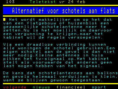 Toen in de jaren zeventig Nederland bekabeld werd, was het belangrijkste doel daarvan dat die 'foeilelijke antennewouden' van de daken zouden verdwijnen. Meteen werden er door de plaatselijke overheden overal antenneverboden ingesteld. Zij waren het immers die geld investeerden en als mensen nu niet 'aan de kabel' zouden gaan en hun oude roestsprieten van het dak zouden halen dan werd het geld nòg voor niets uitgegeven. Veel mensen lieten zich destijds intimideren, en ondanks dat ze dat soms eigenlijk niet wilden, hielden ze zich aan wat zij dachten dat de regels waren en haalden hun antennes weg. Nou had de kabel in die tijd ook wel een aantal voordelen. In prijs verschilde het niet heel veel van een antenne-installatie op het dak, als die tenminste niet vroegtijdig van het dak geblazen werd, (in dat geval viel de kabel namelijk veel voordeliger uit). Het aantal zenders met een eigen antenne beperkte zich afhankelijk van de geografische ligging tot slechts enkele zenders. Nooit meer dan zes of acht. Maar met de kabel waren dat er vaak al zestien of meer. Bovendien verschenen al snel de eerste satellietkanalen; in een tijd dat een eigen satellietontvanger alleen nog voor de zeer rijke particulieren was weggelegd.