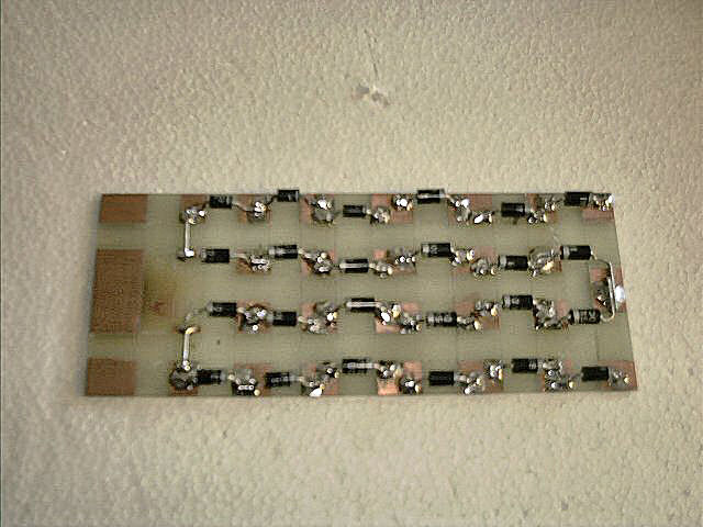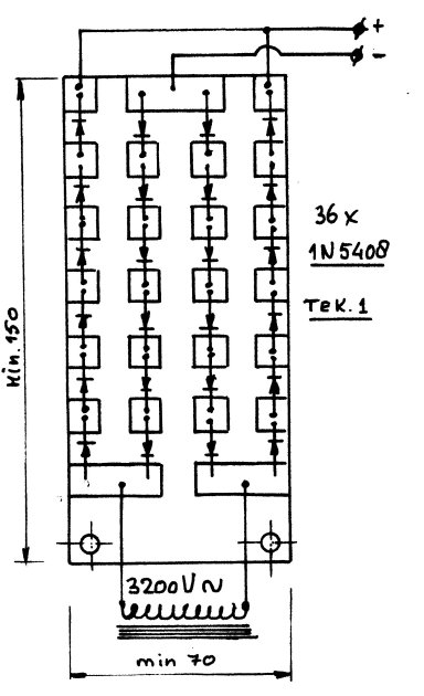 Op foto 4 is een printplaatje te zien met een aantal diodes. Deze is gemaakt volgens het schema van figuur 1. Het maken van zo'n printplaatje is erg eenvoudig, uitgaande van enkelzijdig epoxy printplaat van 1 à 3 millimeter dik, niet kritisch dus. Teken met een dunne viltstift eerst de vakjes die u wilt 'overhouden'. Ga daarna met een stanleymes langs een stalen liniaal over deze viltstift lijntjes. Met andere woorden: maak een dikke inkerving in de koperfolie. Verwarm vervolgens het te verwijderen koper met een soldeerbout, voeg flink veel tin toe, en trek met een pincet het koper weg tussen de 'eilanden'. Houd bij het aantrekken van de folie steeds de soldeerbout op de plaats waar het koper loslaat van de epoxy ondergrond. Ziedaar: binnen tien minuten heeft u een prachtig printplaatje voor de hoogspanningsdiodes. Maak het printplaatje niet te klein en houd er rekening mee dat tussen de + en de - een spannings verschil staat van 4000 volt! Dus 1 centimeter ruimte tussen de eilanden kan geen kwaad. Natuurlijk kunt u het plaatje in plaats van bovenstaande werkwijze ook gewoon etsen.