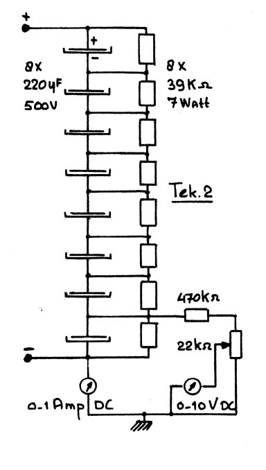 Echter, deze weerstanden krijgen nog een andere functie. Gezien het feit dat de tolerantie van elektrolytische condensatoren binnen de zeer ruime grens ligt van -10 en + 20% zult u begrijpen dat ook de inwendige wisselspanningsweerstand van deze condensatoren onderling nogal verschillend kan zijn. Zonder bleeders zou dat betekenen dat over de ene condensator bijvoorbeeld 550 volt gelijkspanning zou staan, en over zijn buurman slechts 450 volt. Het gebruik van bleeders is ook uitstekend geschikt om die verschillen weg te werken. Omdat de weerstand van de bleeders vele malen kleiner is dan de hierboven genoemde inwendige weerstand van de condensatoren zal de aangelegde spanning zich keurig in dezelfde proporties over alle condensatoren verdelen. In tekening 2 is aangeven hoe een en ander geschakeld is.