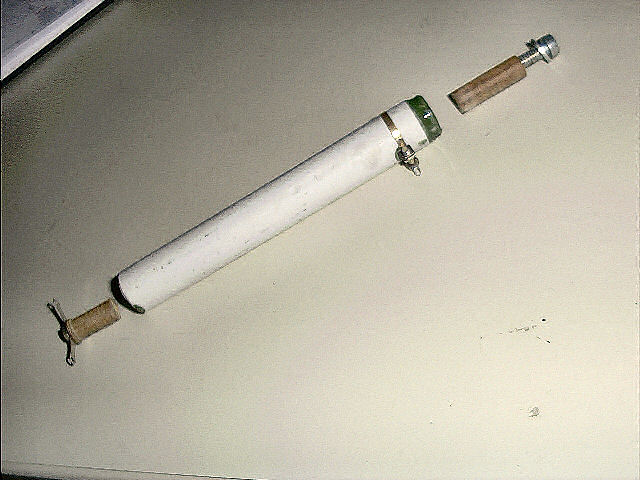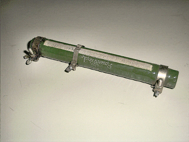 ergens een keramische vermogensweerstand liggen, zo'n groene van ongeveer 10 cm lang en 2 cm in diameter.