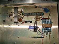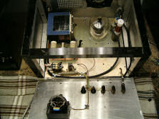 Links in de bovenhoek van foto 1 is de gloeistroomtransformator opgesteld, voor dit type buis hebt u 5 volt nodig bij 14 ampère. Het hier toegepaste type is een bekende blauwe van Philips waarbij drie secties van elk 6 volt parallel zijn geschakeld. Er bleven nog twee secties over van elk 6 volt, wat in serie en daarna gelijkgericht de benodigde 12 Volt DC opleverde voor het bedienen van de